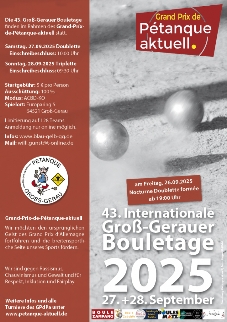 Die 43. Groß-Gerauer Bouletage finden am 27. und 28. September im Rahmen des Grand-Prix-de-Pétanque-aktuell 2025 statt.
