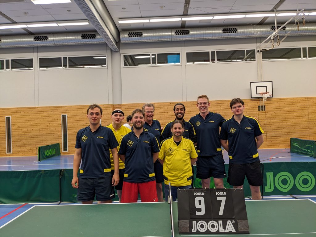 Der erse Satz im Abschlussdoppel ging an die Darmstädter. Tobias Schuster unsd Kevin Hidenbrandt fanden zu selten die Mittel um gegen ihre defensiv agierenden Gegener zu punkten. Im zweiten Satz gelang es den beiden deutlich besser und in der Folge ging der zweite Satz mit 11:5 an die Blau-Gelben. Im dritten Satz sah das Doppel aus Groß-Gerau lange wie der sichere Sieger aus ehe die Darmstädter im Endspurt den Satz noch klauten. Entsprechend groß war der Frust in der Satzpause. der vierte Satz ging wieder hauchdünn an die Blau-Gelben. Der Entscheidungssatz und letzte Satz des Spiels gehörte ganz den Blau-Gelben. Tobias Schuster und Kevin Hildebrandt zeigten eine taktisch und spielerisch makellose Leistung und gewannen den Satz überdeutlich. Nach verwandelten Matchball brachen alle Dämme und die Blau-Gelben lagen sich in den Armen.